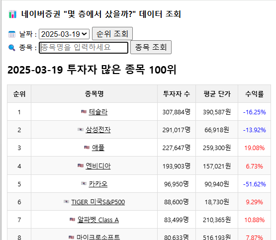 주식 종목을 찾을 때, 네이버증권의 "몇 층에서 샀을까?"를 많이 참고하고 있습니다.이 메뉴에서는 "투자자 수, 평단, 수익률"을 볼 수 있어 인기 종목인지 혹은 상승 중인지 하락 중인지 등을 참고할 수 있습니다. 다만, 현재의 데이터만 보여주기에 추이를 알려면 데이터를 수집하는게 좋겠다 생각했고,25년3월9일부터 오전 6시에는 미국 주식을 오후 4시에는 한국 주식의 데이터를 수집했습니다. 그리고...일주일 이상의 데이터가 모여 간단한 웹 페이지를 만들 수 있게 되었고,최근 개선이 어느정도 완료되어 배포하게 되었습니다. (아직 부족하지만...) https://marketward.co.kr/ 네이버증권 "몇 층에서 샀을까?" 데이터 조회70 SK 10,737명 222,820원 -38.52%marketwa..